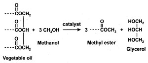 Biodiesel, defined as the monoalkyl esters of fatty acids from vegetable oils and animal fats (1), neat and blended with conventional diesel fuel has significant potential as alternative diesel fuel (2, 3). Initial stages of commercialization have been successful. Biodiesel is usually obtained from the neat vegetable oil by transesterification with an alcohol, usually methanol, in presence of a catalyst, usually a base such as KOH (Fig. 1). Glycerol is a by-product of the reaction. Other possible materials in biodiesel include residual alcohol, moisture, unreacted feedstock (triacylglycerides), incompletely reacted mono- and diglycerides, and free fatty acids.