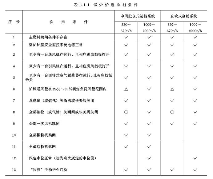扫条件。吹扫条件应根据锅炉容量和制粉系统的类型按表3.1.1所列确定。