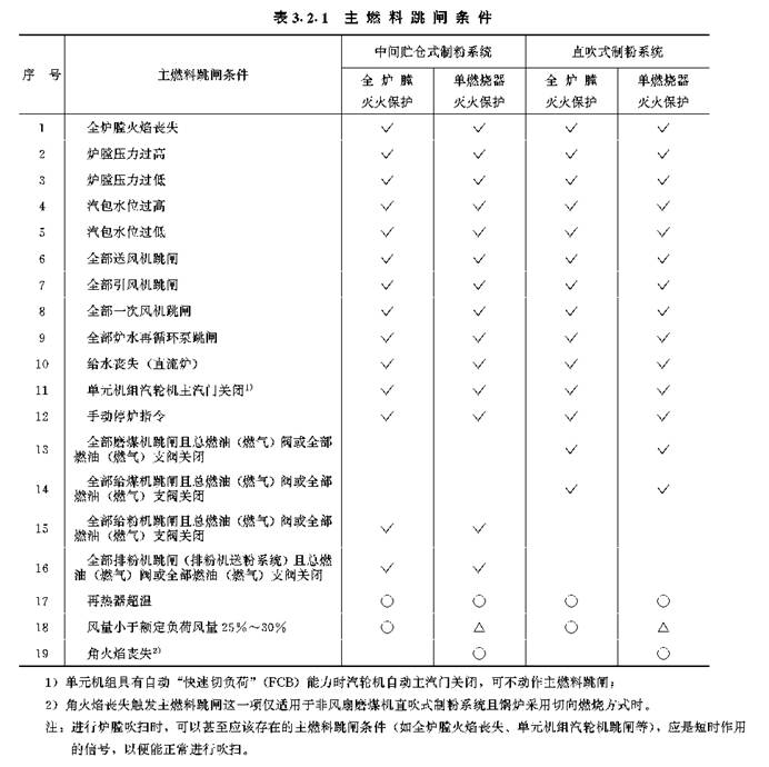 3.2.1 锅炉主燃料跳闸条件应根据火焰监视和保护方法以及制粉系统类型确定,至