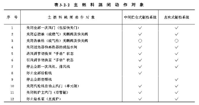 3.2.2 锅炉主燃料跳闸的动作对象应按表3.2.2确定。
