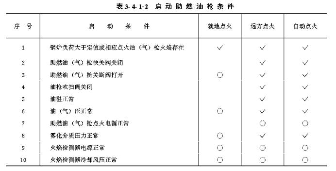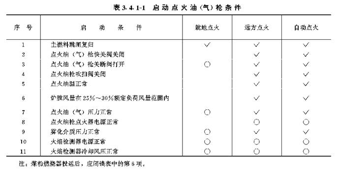 3.4.1 锅炉点火油(气)枪和助燃油枪的启动条件应根据点火方式分别按表3.4.1-1和