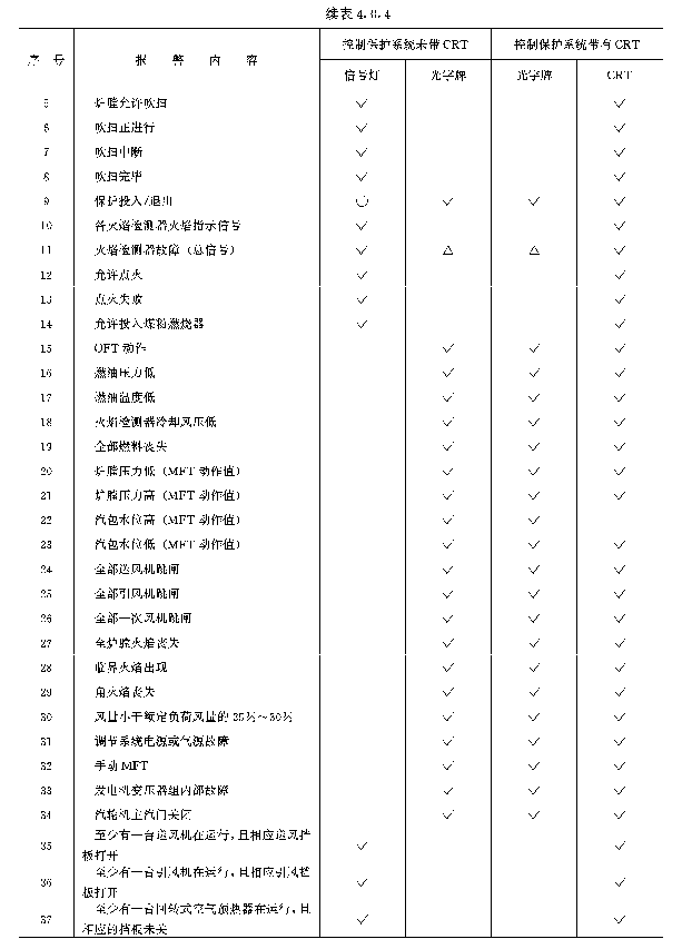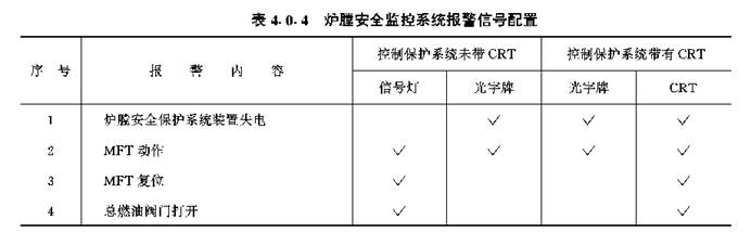 表4.0.4 炉膛安全监控系统报警信号配置