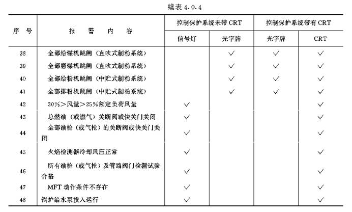 4.0.4 在控制盘(台)上应设必要的报警信号,具体配置应按表4.0.4确定。当锅炉炉