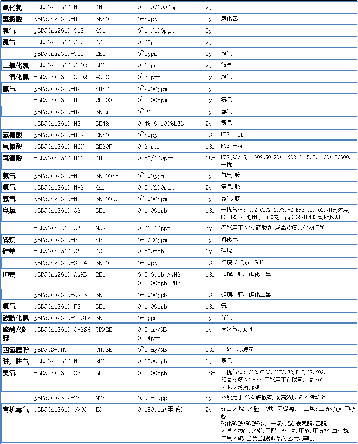 常见气体及量程资料 http://www.big-dipper.com/Products/BD2000/GasSensorListC.pdf