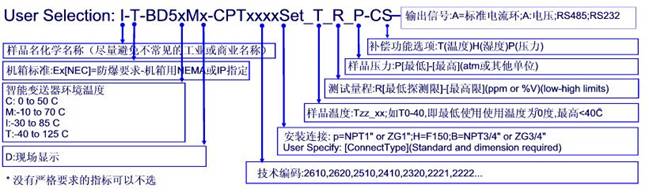l BD5后面的2个字符“xyz”分别代表耐候性(C=商用级,M宽温型,I工业级,T军品)、处理器级别(S=小型处理器,B中型,M中大型,C大型)、和显示器(Dxx,变送器一般带2x16LCD)。具体含义请参考有关BD5的选型资料。